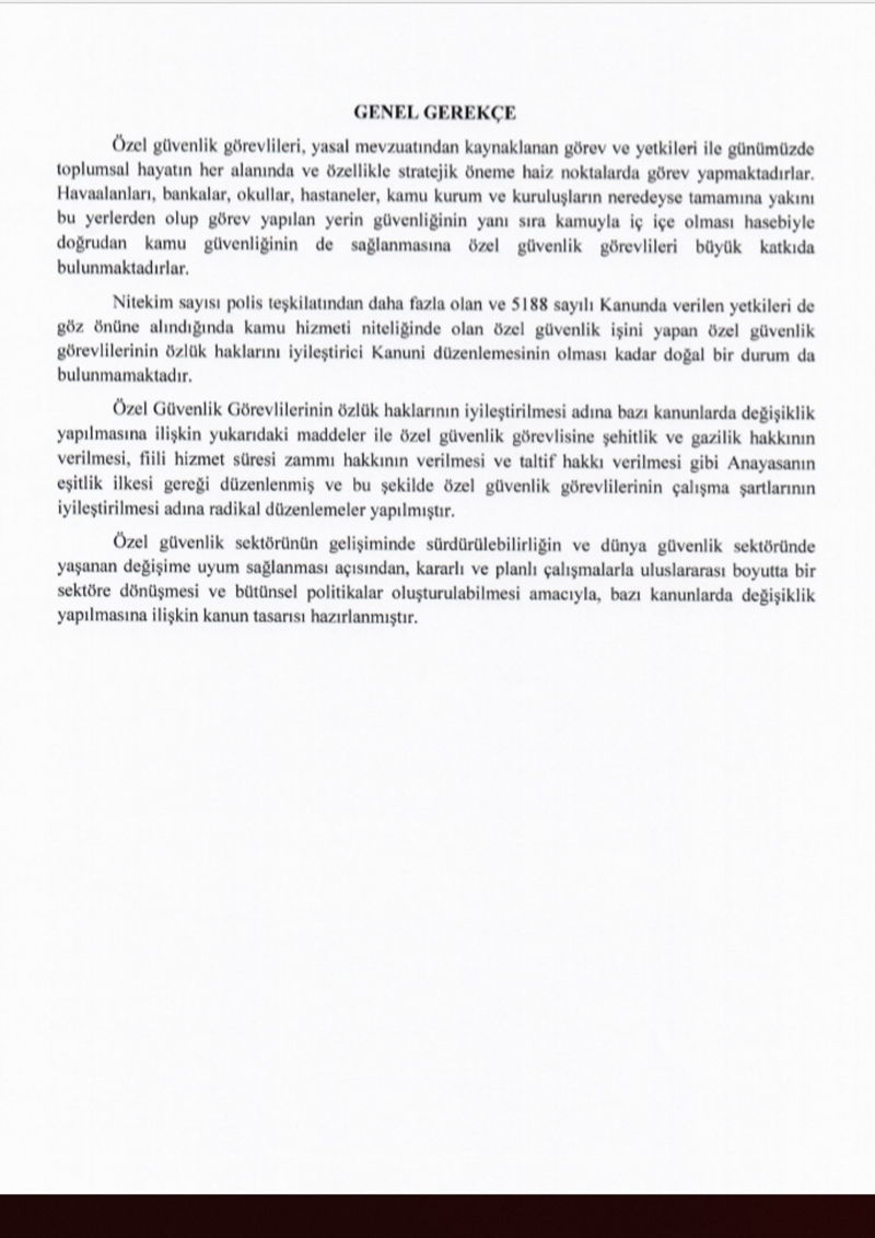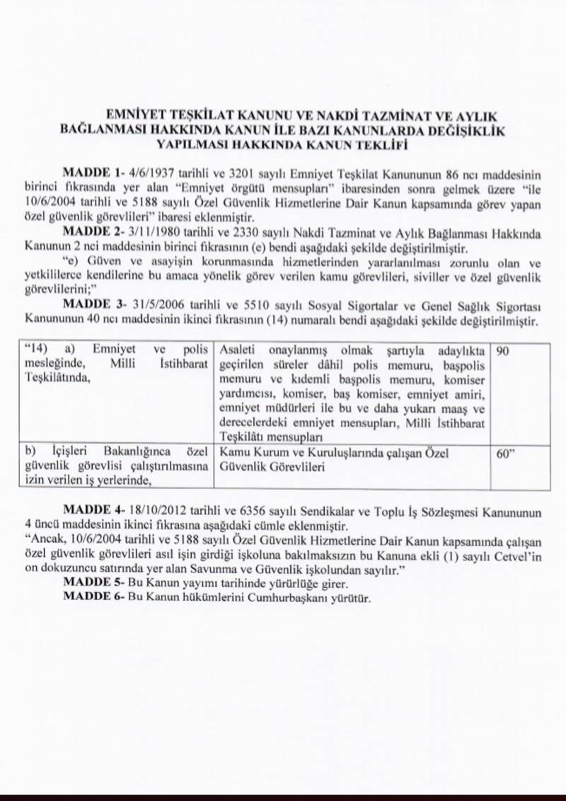 5188 sayılı Özel Güvenlik Hizmetlerine Dair Kanun kapsamında çalışan özel güvenlik görevlilerinin çalışma koşullarının iyileştirilmesine yönelik olarak Emniyet Teşkilat Kanunu ve Nakdi Tazminat ve Aylık Bağlanması Hakkında Kanun ile Bazı Kanunlarda Değişiklik Yapılması Hakkında Kanun Teklifim gerekçesi ile birlikte ekte sunulmuştur.
