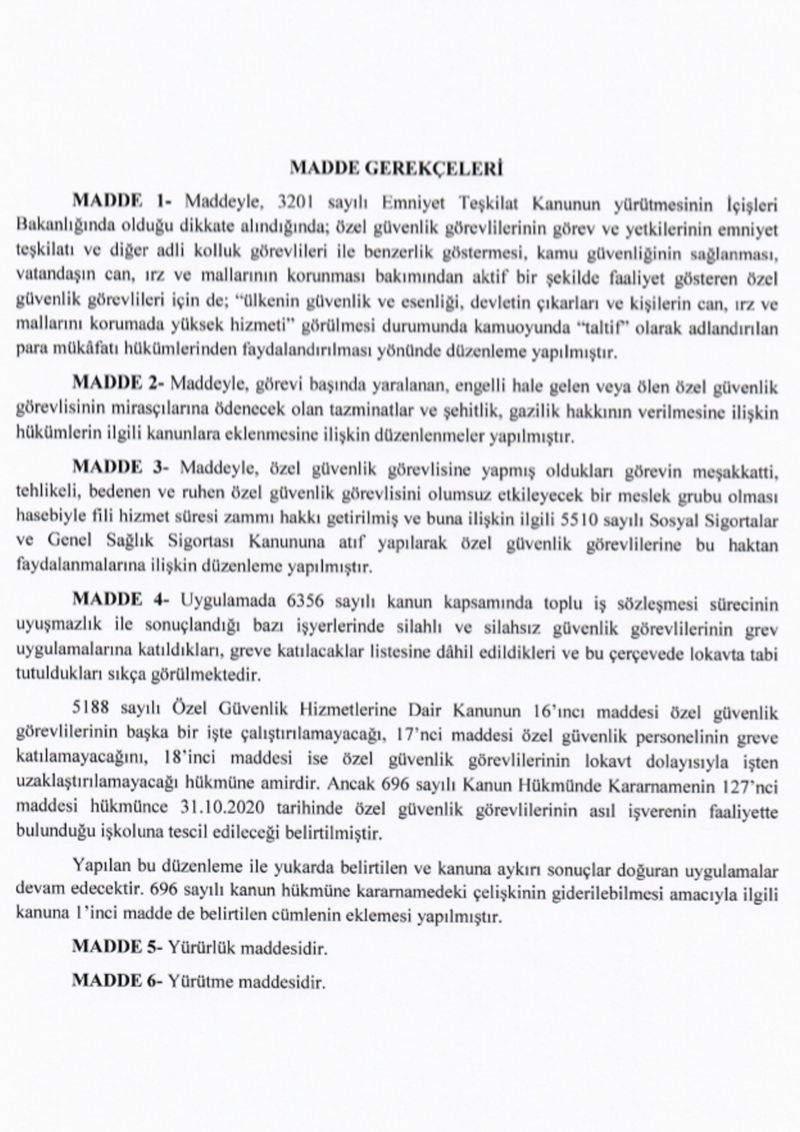 Özel Güvenlik Görevlilerinin özlük haklarının iyileştirilmesi adına bazı kanunlarda değişiklik yapılmasına ilişkin yukarıdaki maddeler ile özel güvenlik görevlisine şehitlik ve gazilik hakkının verilmesi, fiili hizmet süresi zammı hakkının verilmesi ve taltif hakkı verilmesi gibi Anayasanın eşitlik ilkesi gereği düzenlenmiş ve bu şekilde özel güvenlik görevlilerinin çalışma şartlarının iyileştirilmesi adına radikal düzenlemeler yapılmıştır.