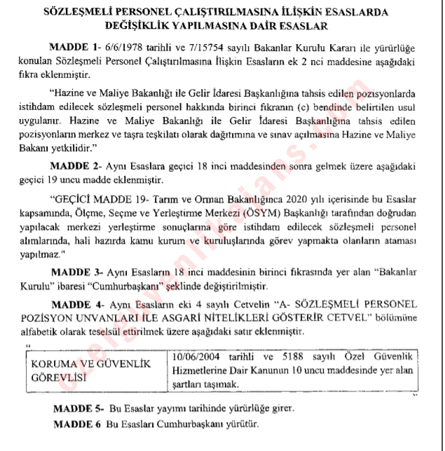 Sözleşmeli olarak çalıştırılabilecek unvanlar arasına "Koruma ve Güvenlik Görevlisi" unvanı da eklendi.Koruma ve Güvenlik Görevlisi olabilmek için 5188 sayılı Özel Güvenlik Hizmetlerine Dair Kanunun 10. maddesinde yer alan şartları taşımak gerekmektedir.