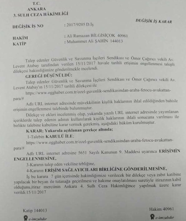 Türk-İş'e bağlı Güvenlik-İş Sendikasını karalayarak belli gruplara hizmet eden sözde haber sitelerinin sahiplerinin ve haberleri maksatlı ve kasıtlı olarak kullanarak algı yapmaya çalışanlar hakkında yargılama süreçleri devam ederken,son olarak yapılan Güvenlik-İş Sendikasından Araba Fetöcü Avukattan Para başlığı ile yapılan haber için Ankara 3.Sulh Ceza Hakimliği tarafından haber yayından kaldırılarak, Haberi yapan ve diğer sendikaların il temsilcilerininde bulunduğu ,haberi maksatlı dağıtanlar hakkında Güvenlik-İş Sendikası tarafından savcılığa suç duyurularında bulunulduğu Maddi ve Manevi ceza davası istemli başvuru yapıldığı haber sitemize iletidi.