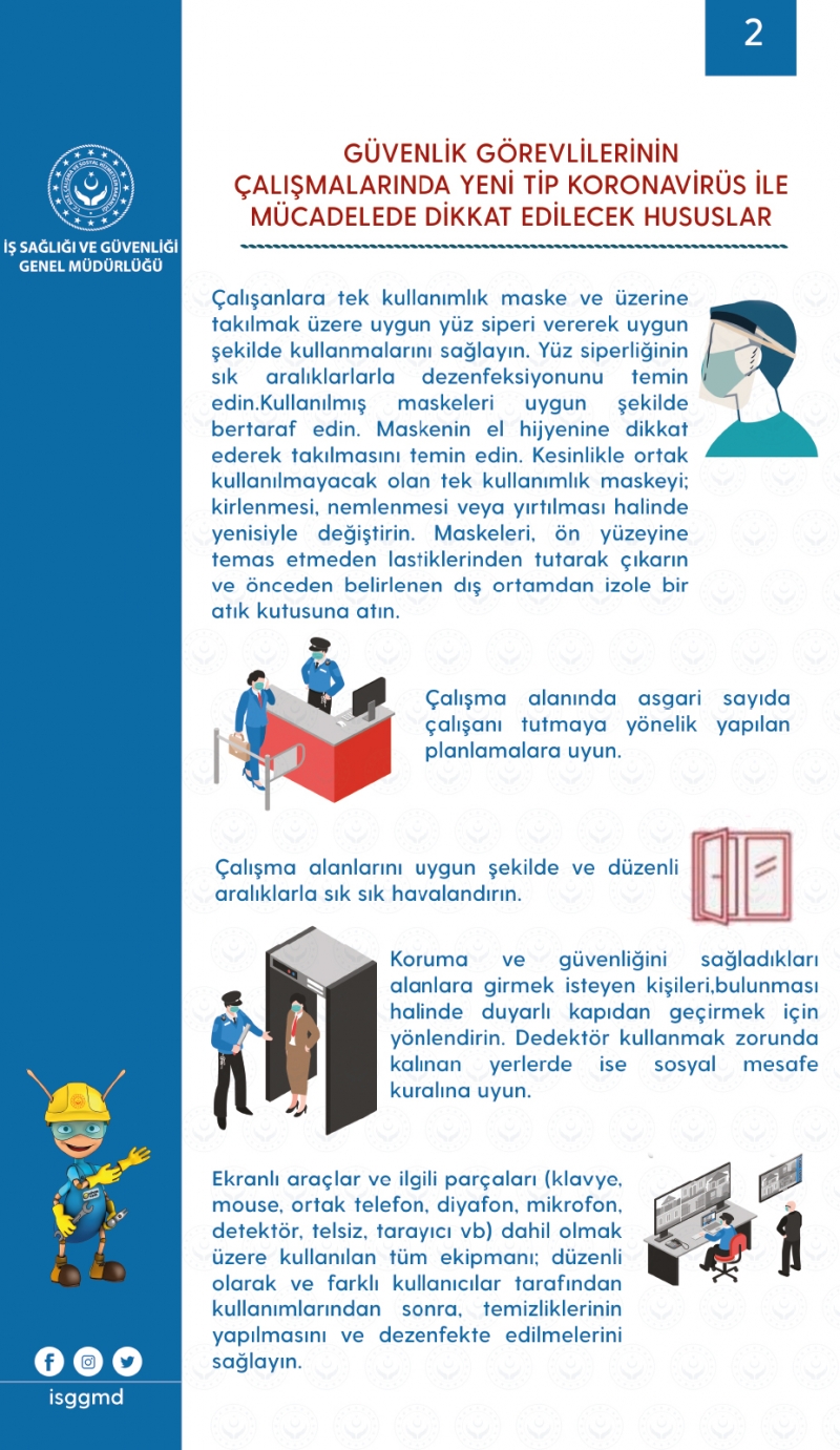 Özel güvenlik görevlileri çalışmalarında Yeni Tip Koronavirüsle etkin mücadele etmek maksadıyla dikkat edilecek hususlara ilişkin İŞ SAĞLIĞI VE GÜVENLİĞİ Genel Müdürlüğünce hazırlanan dokümanlar ve kontrol listeleri tarafların istifadesine sunulmak üzere yayımlandı.