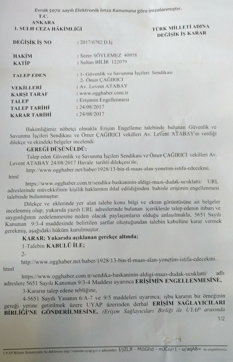 Haber siteleri ve ilgili şahıslar hakkında “Sendikal faaliyetlerin engellenmesi, kişilerin huzur ve sükûnunu bozma, hakaret, iftira” suçlarından suç duyurularının yapılarak işleme konulduğunu bildiren , Güvenlik-İş Sendikası Başhukuk Müşaviri Av. Levent ATABAY; Güvenlik-İş Sendikası Genel Başkanı Ömer Çağırıcı hakkında son zamanlarda sürekli aynı kişiler tarafından sistematik olarak yapılan yalan ve iftira içeren haberlerin malum haber siteleri ve malum şahıslar tarafından yapıldığını ilgili şahıslar ve haber siteleri ile hukuki mecrada mücadelelerinin sonuna kadar devam edeceğini belirtti.